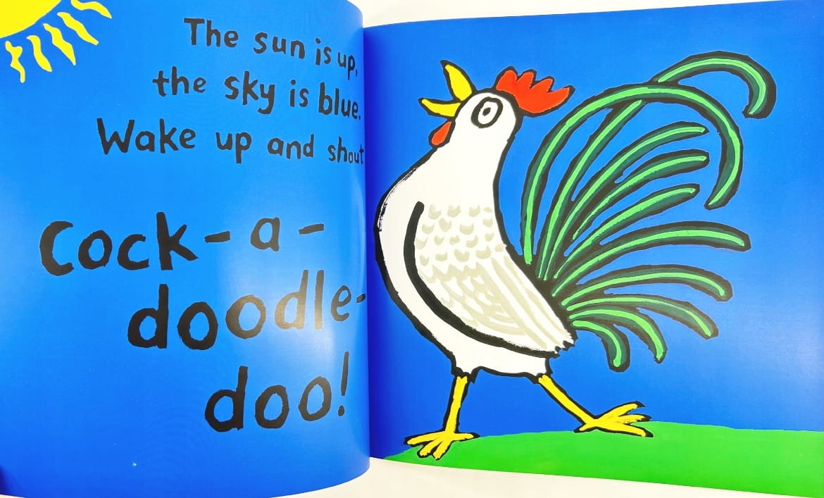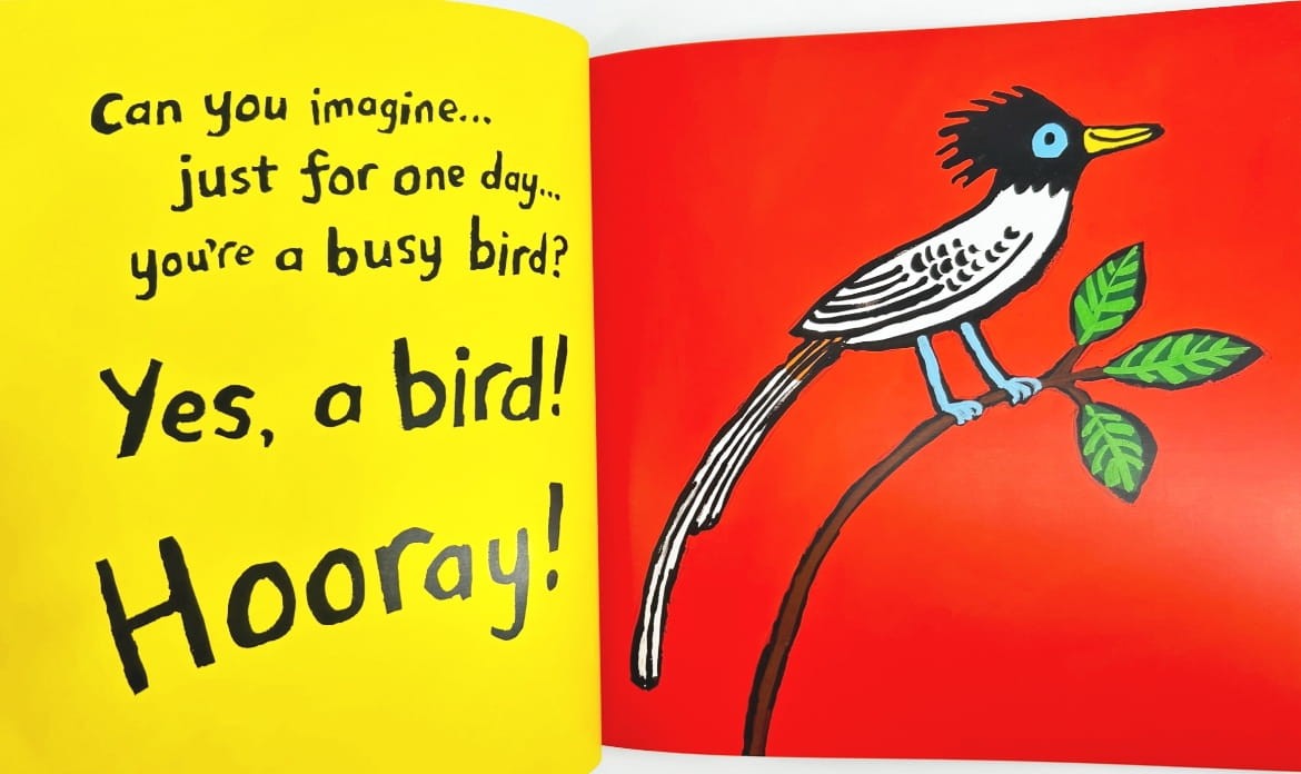 Dziecko „staje się ptakiem” na jeden dzień: macha skrzydłami, skacze, fruwa wysoko, otwiera dziób i śpiewa. Po drodze naśladuje różne ptaki i ich zachowania — można stać na jednej nodze jak flaming, człapać jak pingwin i powtarzać zabawne odgłosy w stylu „cock-a-doodle-doo” czy „tuwit-tuwoo”. To świetna książka do czytania na głos, bo angażuje całe ciało i rozładowuje energię w mądry sposób.