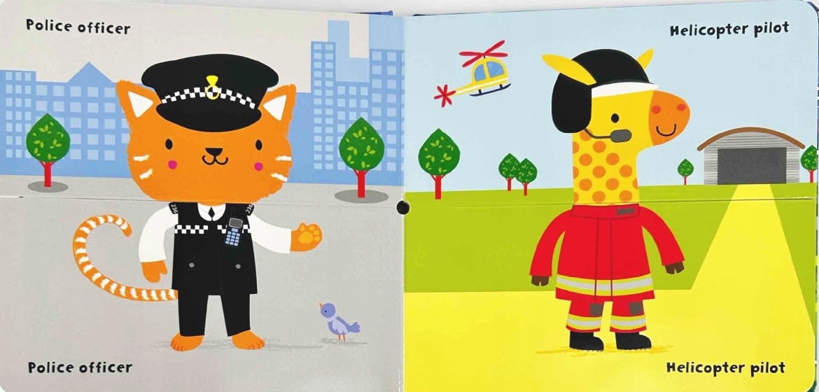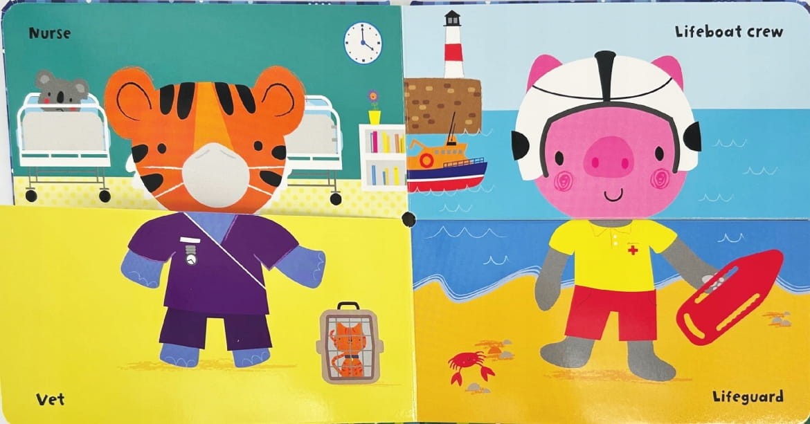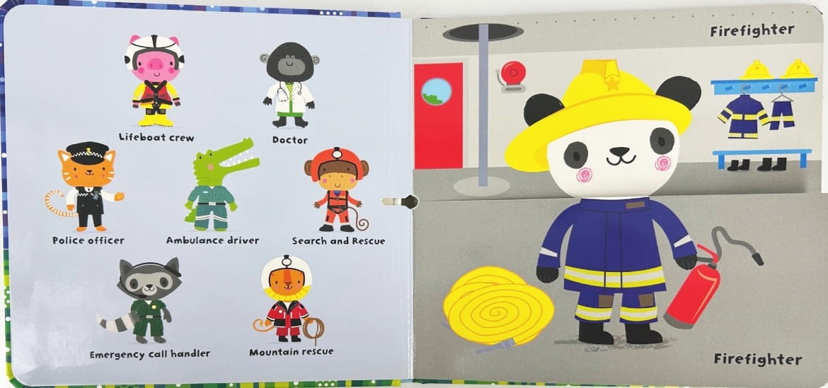 Zabawna i interaktywna książeczka, w której każda strona podzielona jest na dwie części – głowę i ciało. Mali czytelnicy mogą mieszać strony, tworząc ponad 150 różnych kombinacji zwierząt w strojach służb ratunkowych!