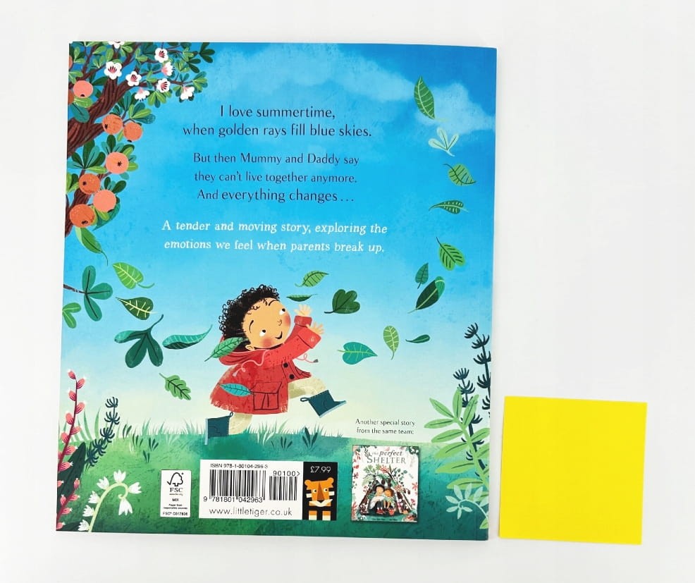 Pewnego dnia wszystko się zmienia – rodzice decydują, że nie mogą już razem mieszkać. W głowie dziecka pojawiają się pytania i trudne emocje: „To nie fair”, „Czy to moja wina?”. Jednak z biegiem czasu i zmianą pór roku, smutne chwile powoli stają się łatwiejsze.