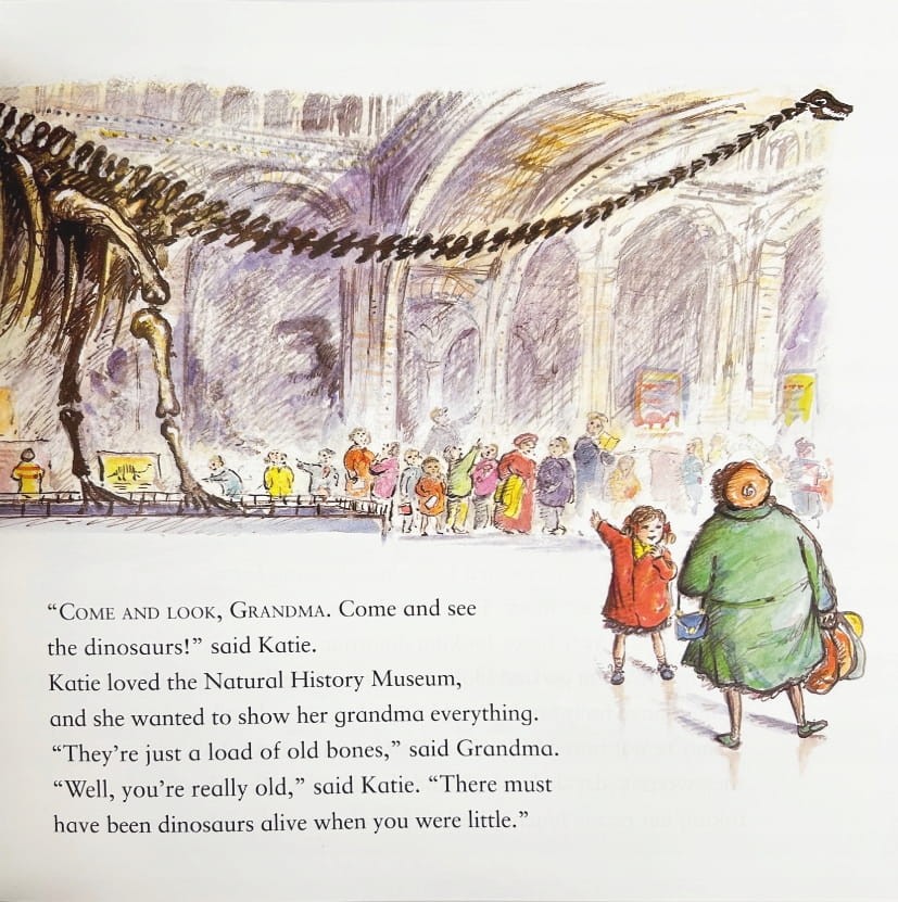 Podczas wizyty w Muzeum Historii Naturalnej Katie znajduje tajemnicze drzwi… które przenoszą ją miliony lat wstecz! Dziewczynka pomaga małemu dinozaurowi odnaleźć jego rodzinę, jeździ na grzbiecie ogromnego brontozaura i urządza piknik z triceratopsem. Ale co zrobi, gdy spotka bardzo głodnego tyranozaura?