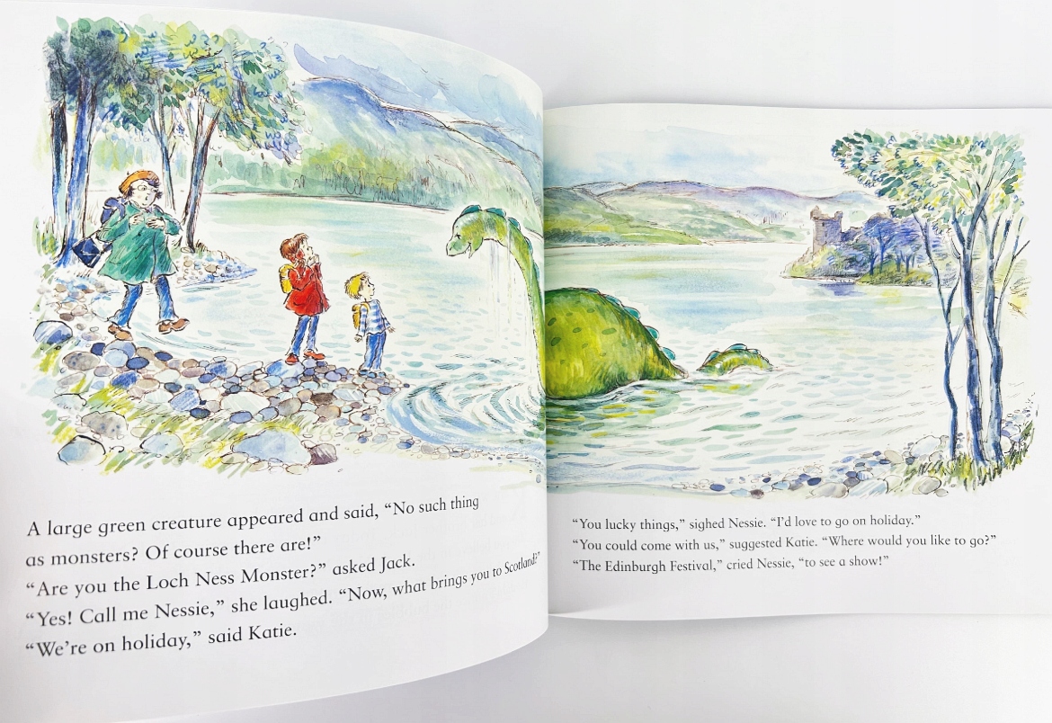 Podczas wycieczki mają wyjątkowego przewodnika – samego potwora z Loch Ness, Nessie! Razem odwiedzają najbardziej znane miejsca w Szkocji – od tętniącego życiem Glasgow i spokojnego Kelvingrove Park, po majestatyczny zamek w Edynburgu, Pałac Holyrood i słynną Royal Mile. Nie mogło też zabraknąć wizyty w Narodowej Galerii Szkocji i spotkania z wiernym pieskiem Greyfriar's Bobby.