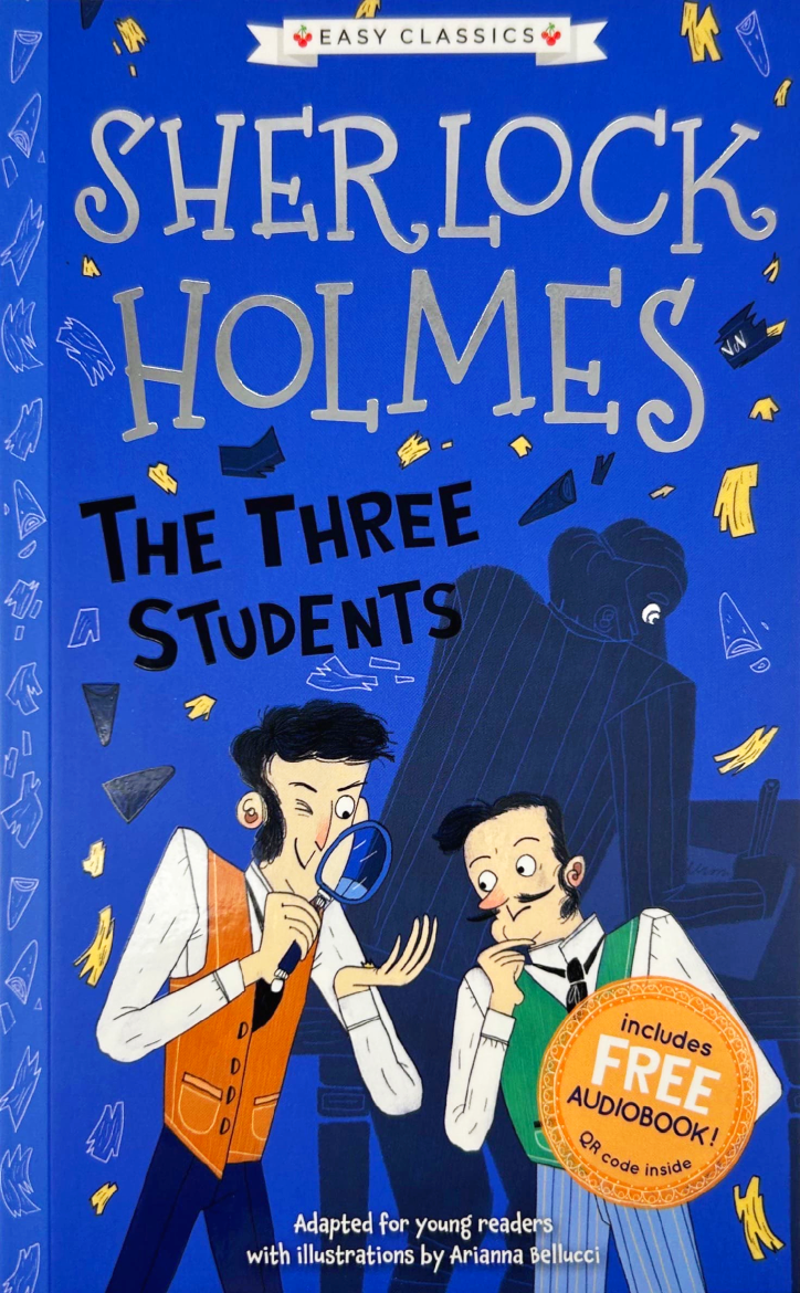 „Sherlock Holmes: The Three Students” to ilustrowana, uproszczona adaptacja klasycznej historii Arthura Conana Doyle’a, przygotowana dla dzieci, które lubią zagadki, śledztwa i błyskotliwe rozwiązania.