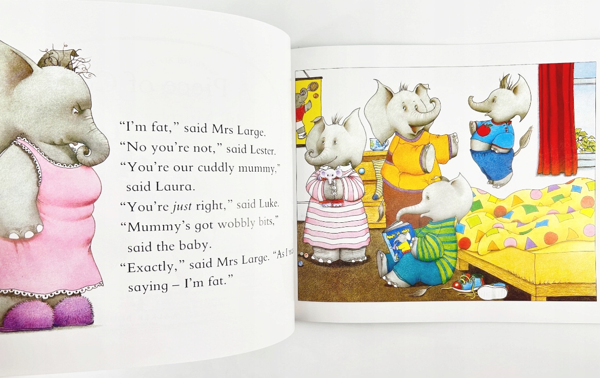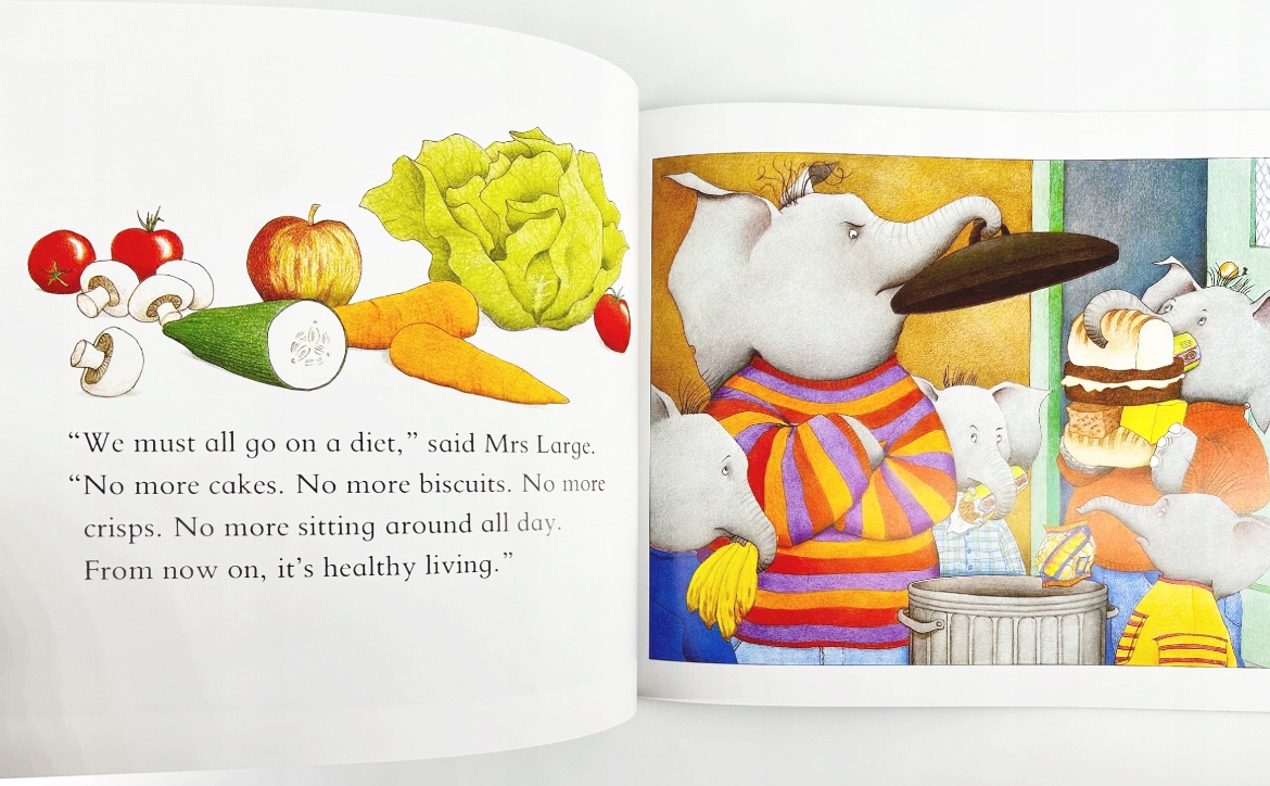 When Mrs Large decides she is too fat, she puts the whole family on a diet. Biscuits and crisps are out; healthy meals and healthy jogs are in. But for hungry elephants, dieting is definitely not a piece of cake!