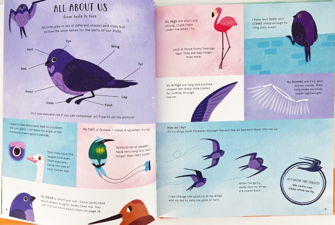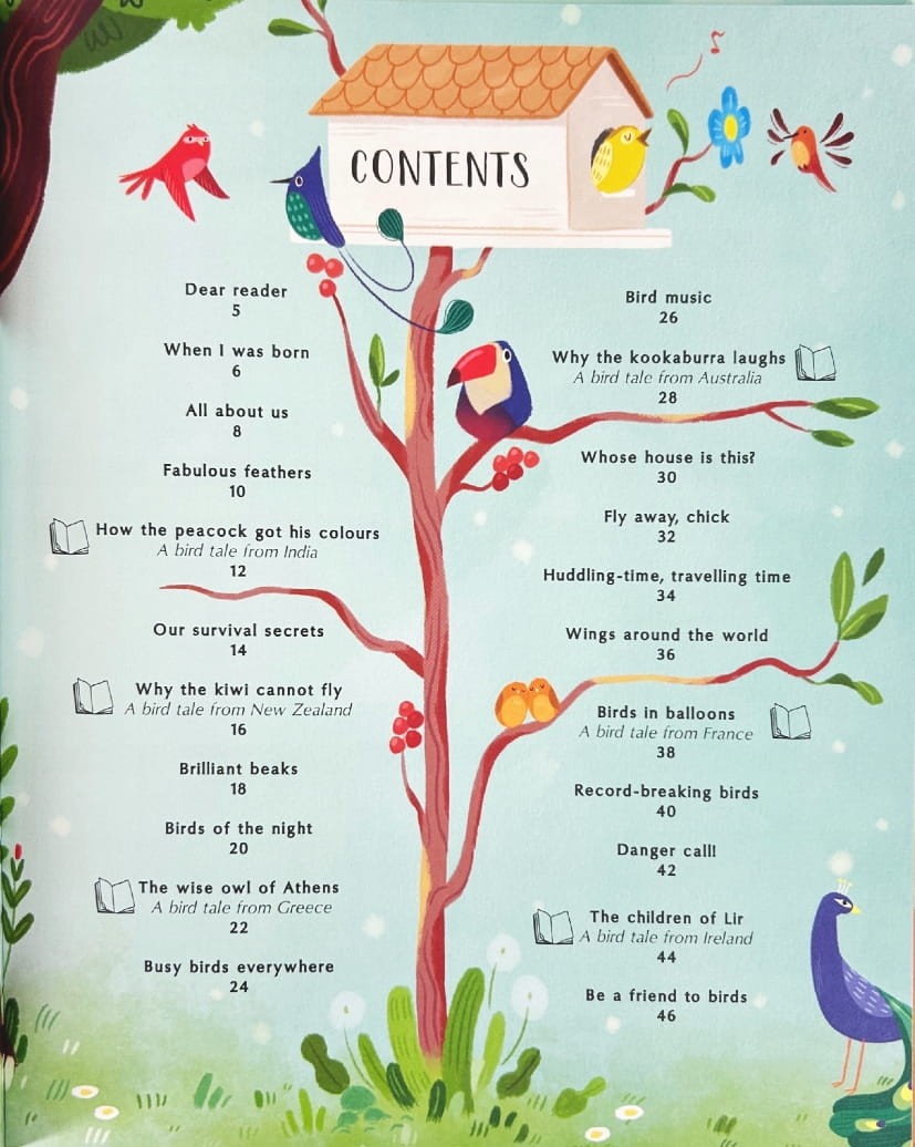 Dzieci dowiedzą się m.in. jak ptaki budują gniazda, jak się porozumiewają, skąd wiedzą dokąd lecieć oraz jak można im pomóc we własnym ogrodzie. Opowieści i fakty są napisane przystępnym językiem, a fantastyczne ilustracje sprawiają, że książkę chce się przeglądać wciąż na nowo.