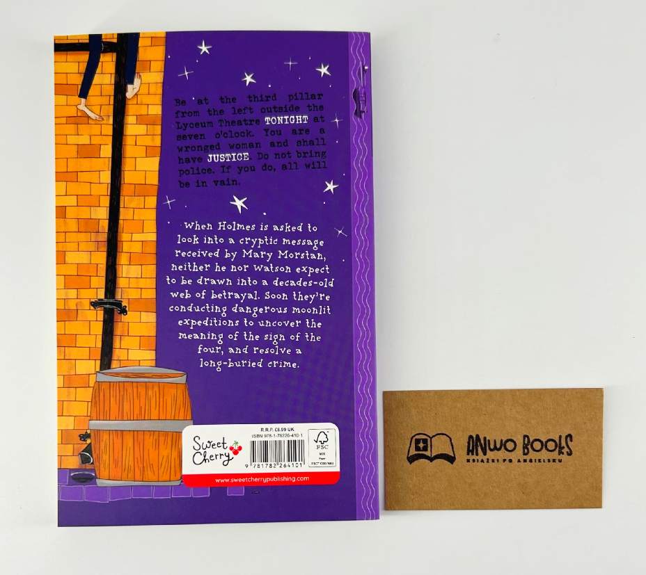 „Sherlock Holmes: The Sign of the Four” to ilustrowana, uproszczona adaptacja jednej z najbardziej znanych historii Arthura Conana Doyle’a. To świetna propozycja dla dzieci, które lubią tajemnice, szyfry, przygody i detektywistyczne śledztwa z wyraźnie poprowadzoną fabułą.