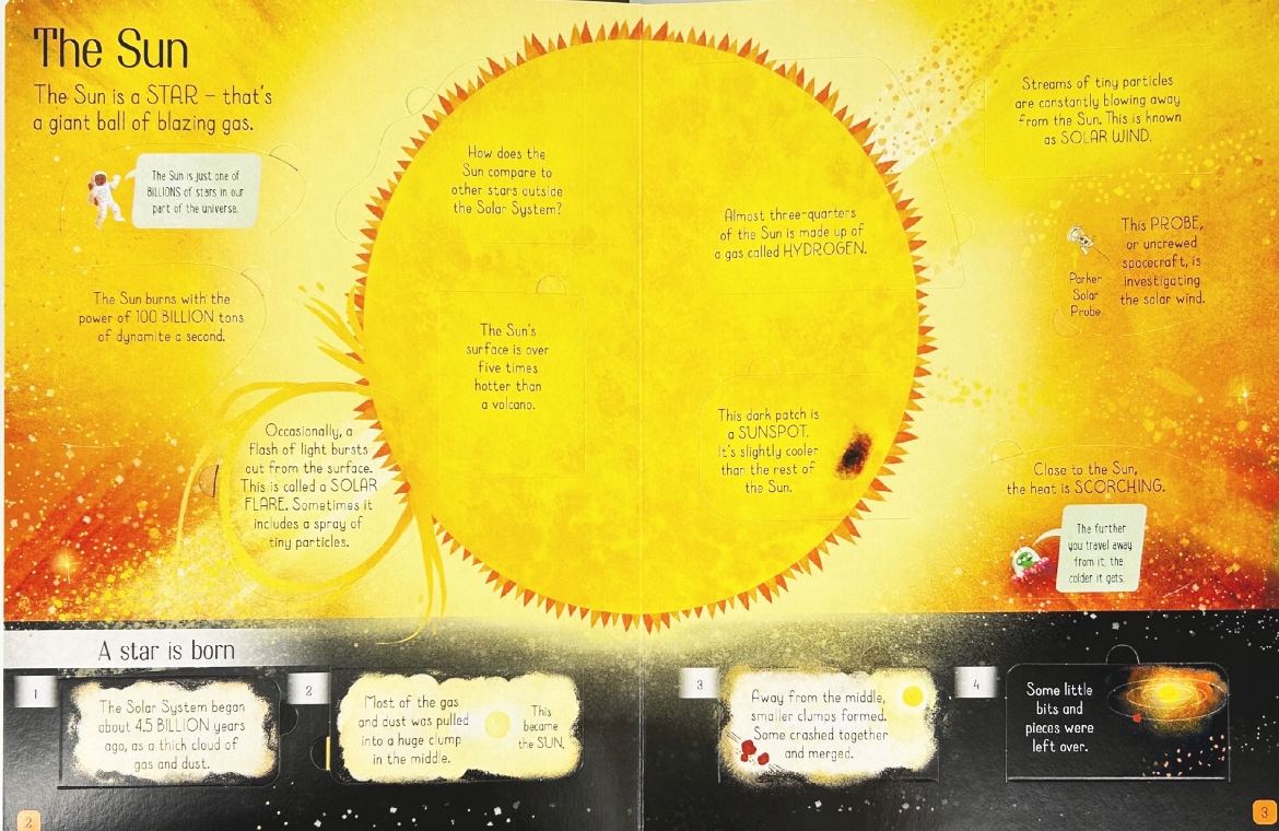 - Interaktywne odkrywanie: Zawiera ponad 50 klapek do otwierania, które ujawniają fascynujące fakty i szczegóły o Układzie Słonecznym.