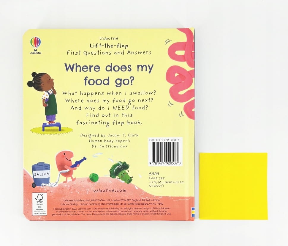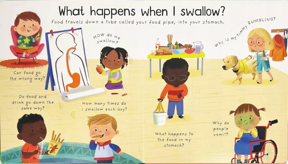 Ta interaktywna książka z klapkami prowadzi dzieci przez całą drogę, jaką pokonuje jedzenie w naszym organizmie, pokazując procesy trawienia w zabawny, ale edukacyjny sposób.
