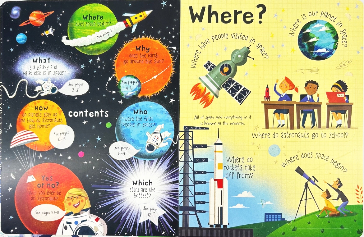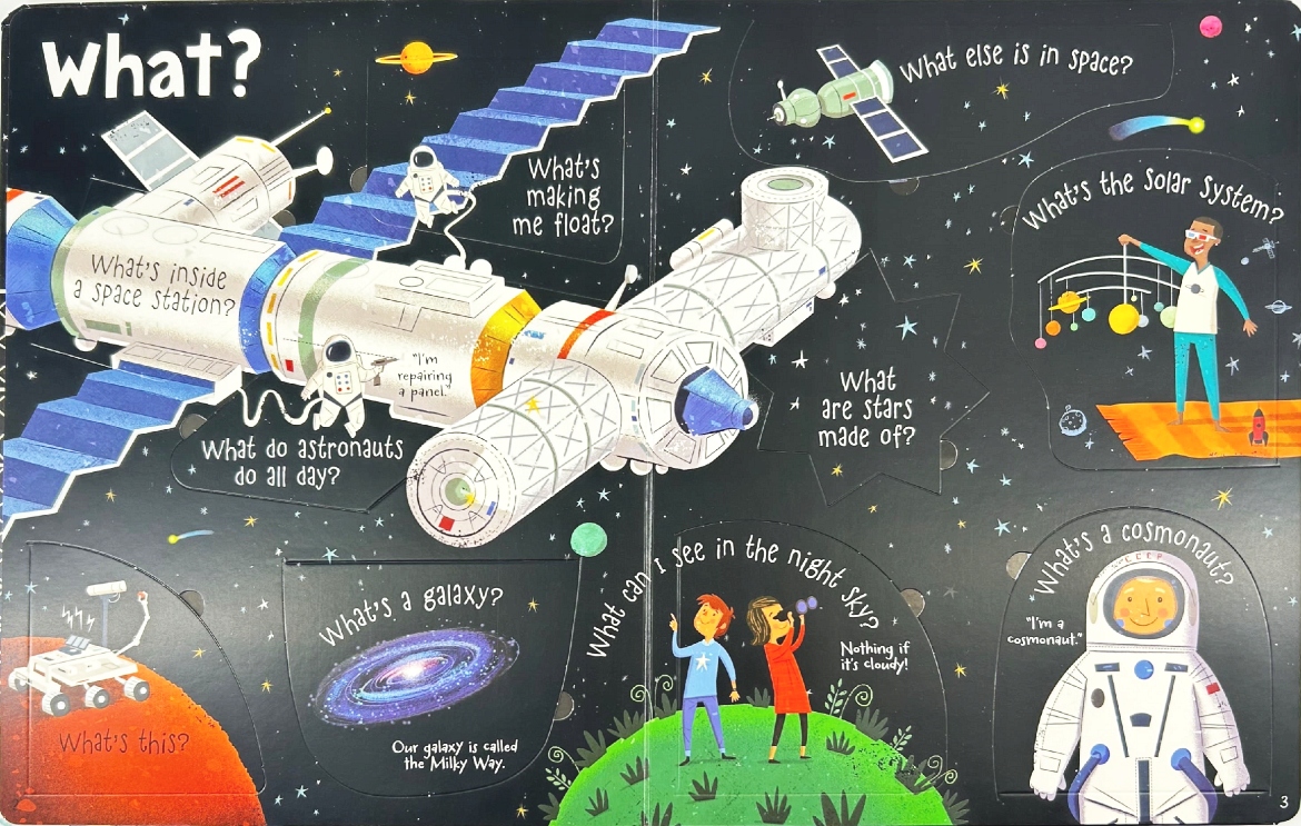 Co to jest kosmonauta? Dlaczego nie widać gwiazd w ciągu dnia? Gdzie ludzie podróżowali w kosmosie? Odpowiedzi na te i wiele innych pytań znajdziesz w tej fascynującej książeczce z ponad 60 klapkami do podnoszenia!