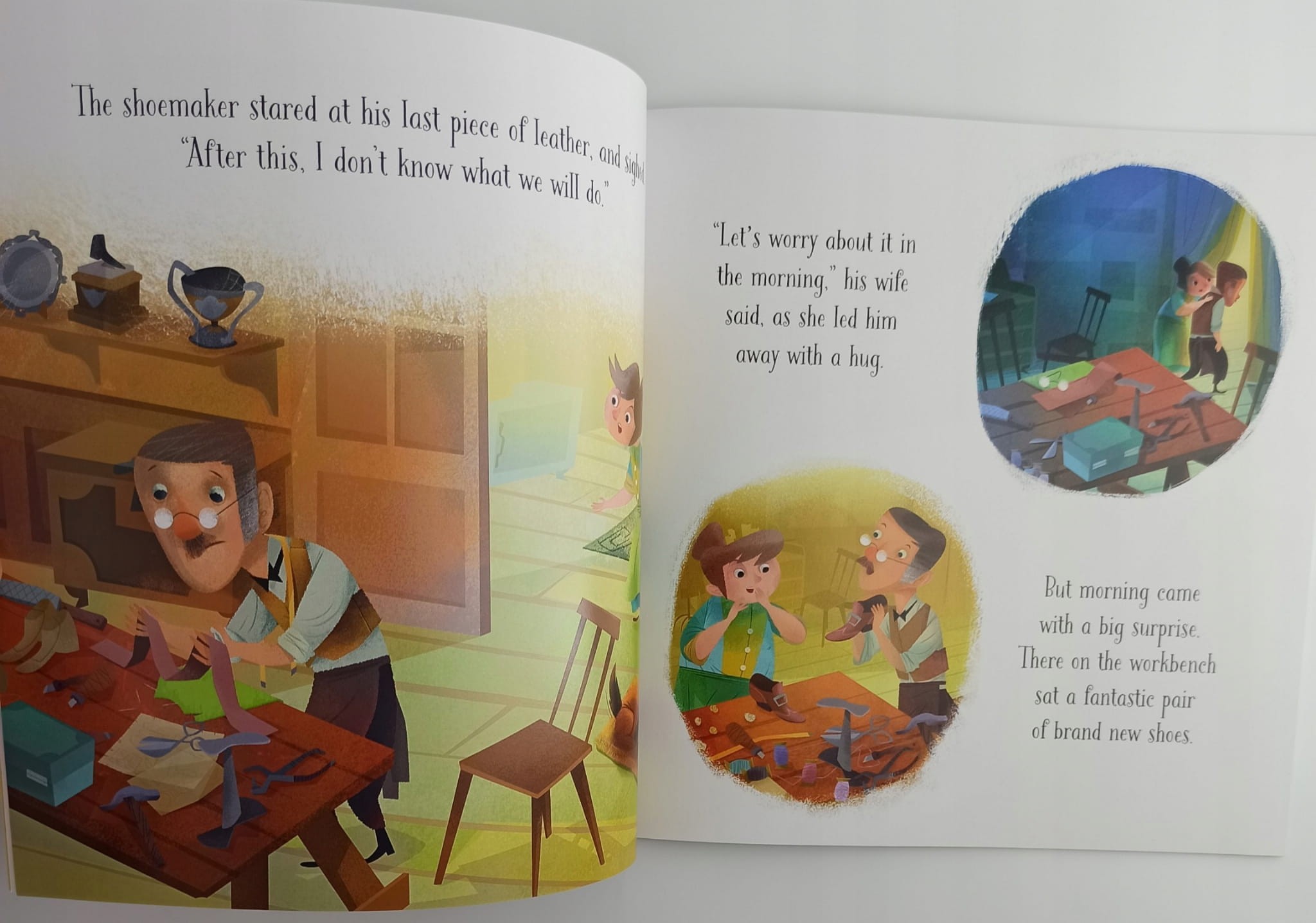 „The Elves and the Shoemaker” to pięknie zilustrowane wydanie klasycznej bajki po angielsku, idealne dla dzieci 4–7 lat. To ciepła historia o życzliwości, wdzięczności i o tym, że dobro wraca — świetna do wspólnego czytania w domu i w szkole.
