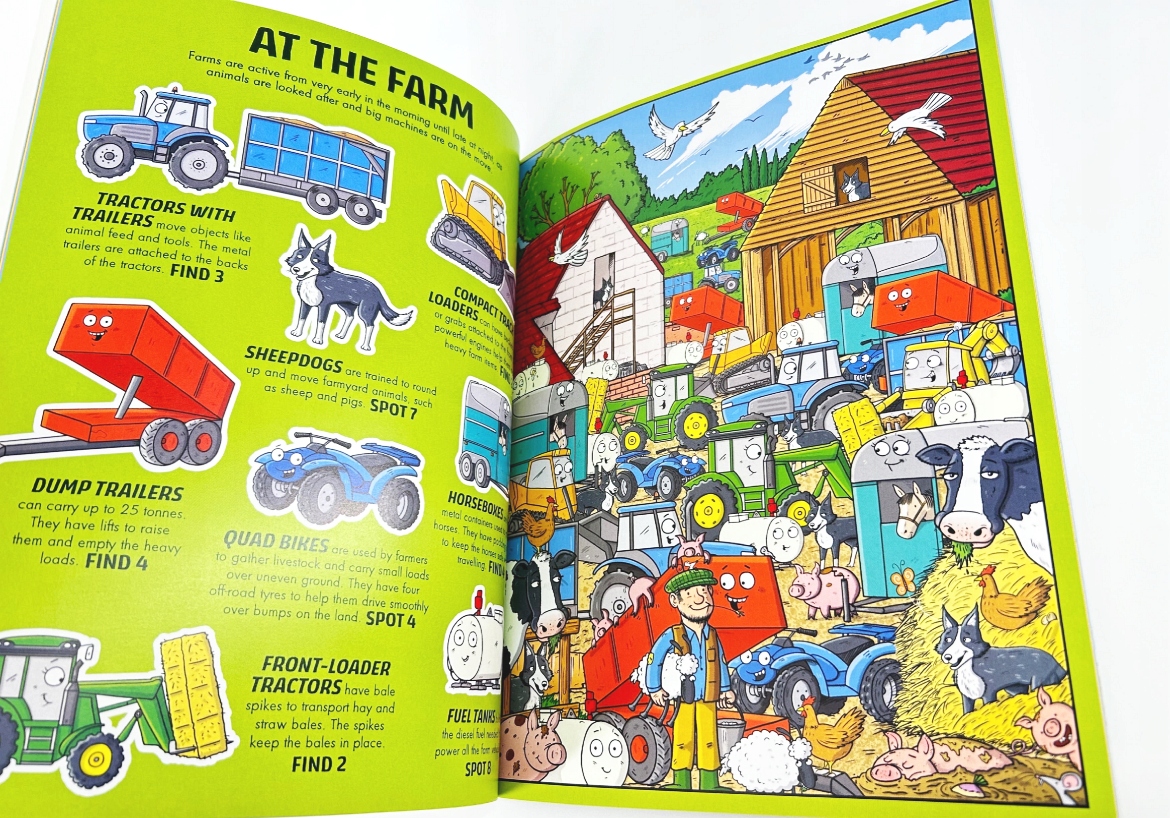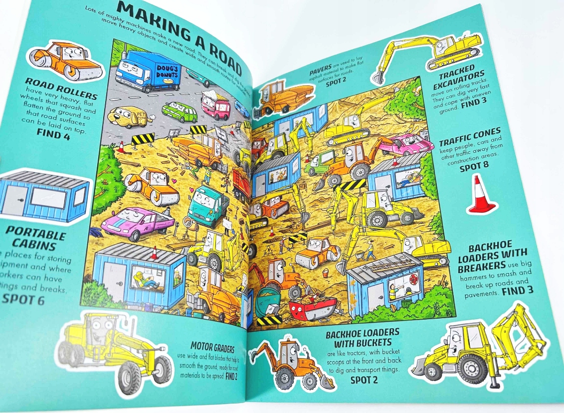 Where’s the Digger? to wciągająca książka typu "search and find", która przenosi dzieci w fascynujący świat budowy i maszyn! Pełna kolorowych scen i ciekawostek, książka oferuje ponad 140 elementów do znalezienia na 18 różnych stronach. Od koparek i dźwigów po kombajny i ciężarówki – mali odkrywcy znajdą tu wszystko, co związane z budową i maszynami.